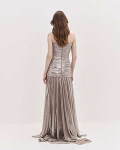 Strapless dress with a softly draped bodice and flowing skirt. Lightweight chiffon with a fluid, luminous finish.