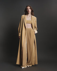 Long velvet coat with a belted waist. Can be paired with matching pants and top.