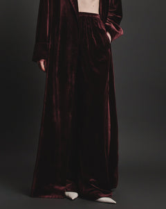 Palazzo pants in velvet with a fluid silhouette. Can be paired with the matching coat and top.