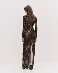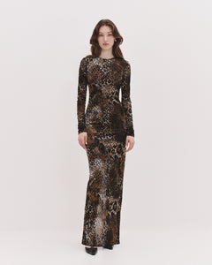 Fitted maxi dress made of sheer stretch mesh with velvet flocking. Semi-transparent, with a delicate leopard pattern.
