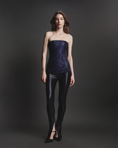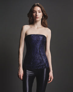 Strapless corset top crafted from laminated lace with a metallic finish.