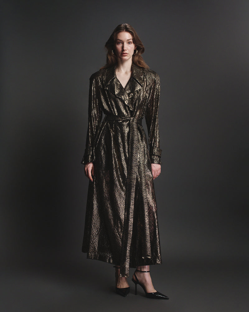 Long trench coat in laminated lace with a metallic finish and a belted waist.