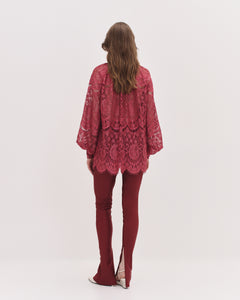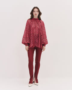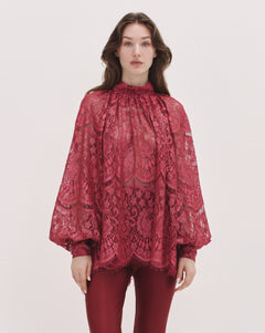 Loose blouse made of floral lace with voluminous sleeves and a high gathered neckline.