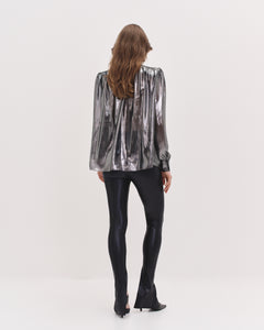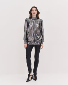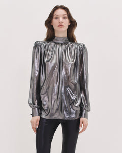 Loose-fit metallic top with high gathered neckline and long sleeves.