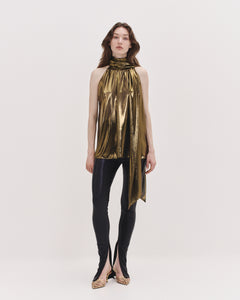 Top in laminated fabric with a high scarf-neck that can be tied into a bow or worn loose.